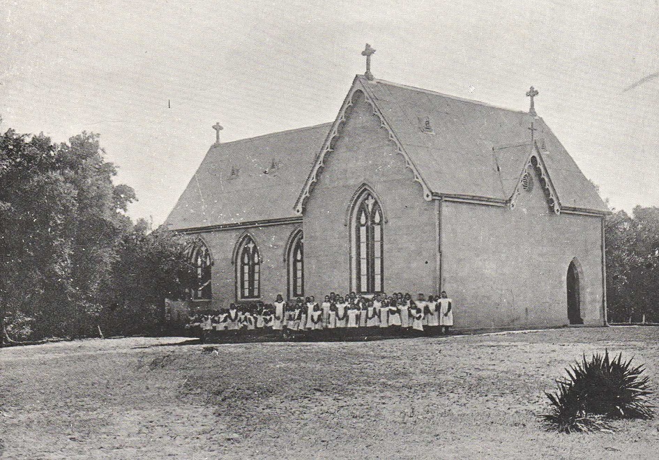This image shows a group of approximately 40 girls in white dresses standing in front of a large church.