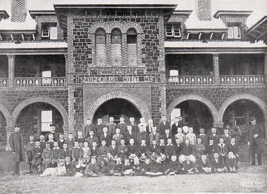 This image shows a group of approximately 60 boys and several adult men sitting or standing in front of a three-storey brick building. The boys range in age from approximately 7 to 16 years old. Two of the boys are holding dogs. ‘Evangelizare Pauperibus Misit Me’ is written on the front of the building, which translates to ‘He has sent me to declare the good news to the poor’.