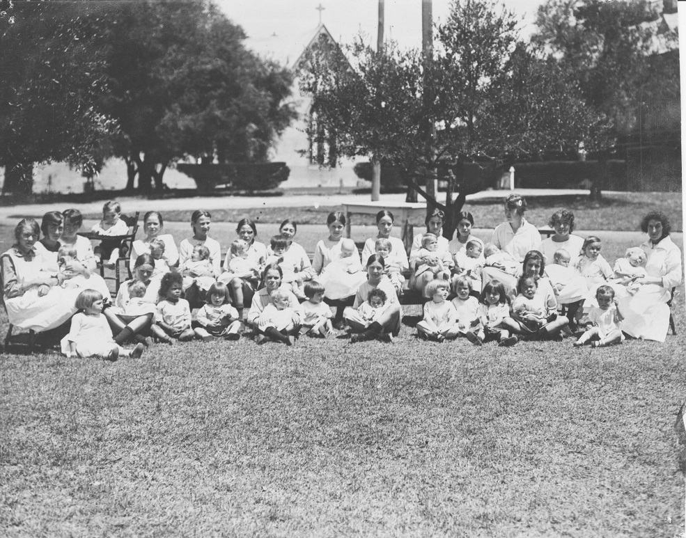 Description: ‘St Vincent’s children’ is a digital copy of an undated photograph from the Institute of Sisters of Mercy of Australia and Papua New Guinea Archives and Heritage Centre. It shows a group of young children and babies in front of the St Vincent’s Foundling Home. Also present are older girls, who would have been from the St Joseph’s Girls’ Orphanage. These older girls helped staff and sisters care for the children in St Vincent’s. An approximate date range of 1914 to 1950s has been given, based on the children’s clothing.