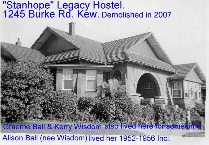 Description: This is a copy of an image that appeared in a publication by Alison Cathleen Ball. It is captioned “‘Stanhope’ Legacy Hostel, 1245 Burke Rd, Kew. Demolished in 2007. Graeme Ball & Kerry Wisdom also lived here for some time. Alison Ball (nee Wisdom) lived here 1952-1956 incl”.