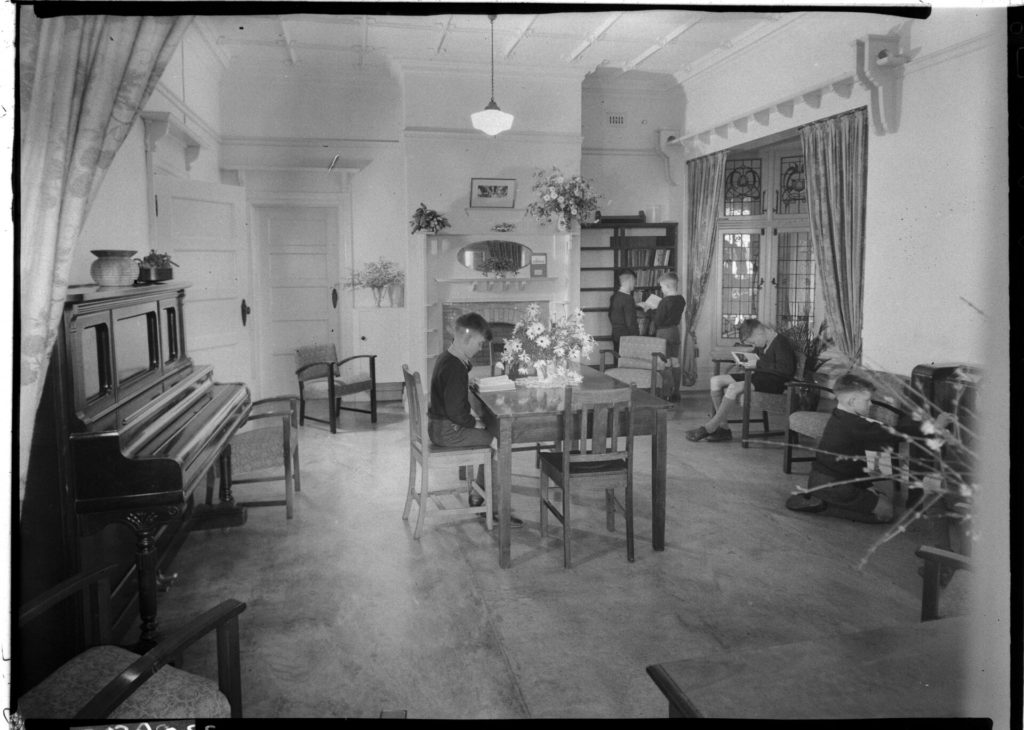 Description: This is a photograph showing boys reading books at the Weroona Home. It shows five boys in a large room furnished with a piano, a bookcase, a table and chairs. Most of the boys are reading or looking at books on the book case, and one boy appears to be kneeling in front of a radio.