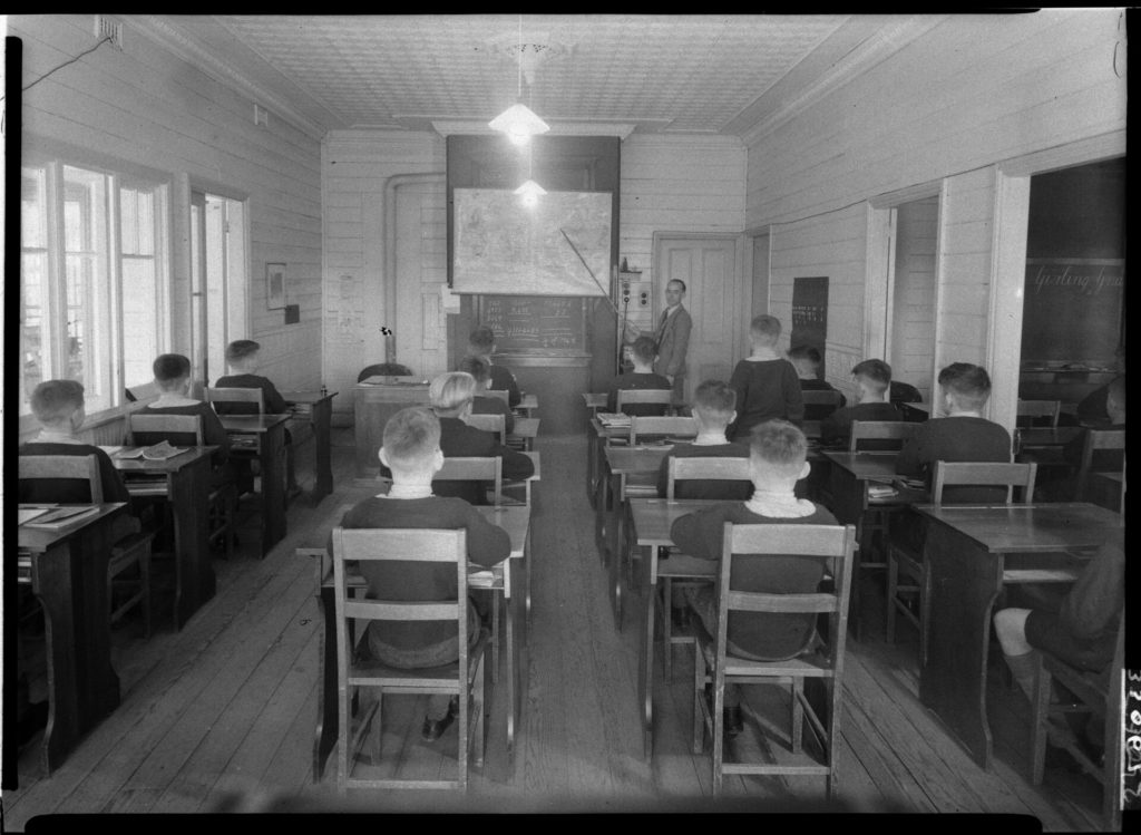 Description: This is a photograph of boys in a classroom at Weroona Home. It shows 16 boys seated at desks in a classroom, facing a teacher pointing to the board at the front of the room. Another classroom can be seen through a doorway to the right of the photograph.