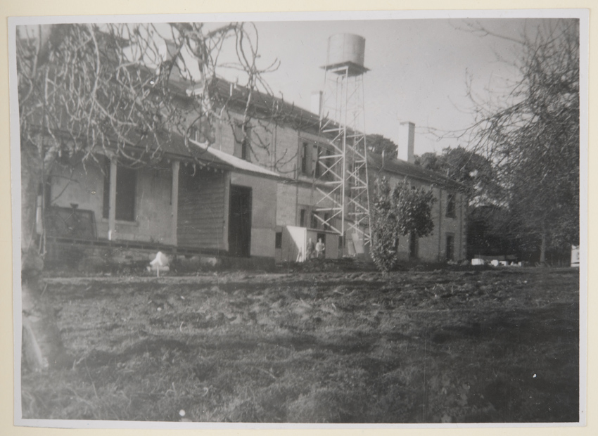 Description: This is a a copy of a photo from the archival series ‘Photographs of Departmental Institutions’, Volume 2, the original caption states: Rear of the Home, showing newly erected water tower, 1948.