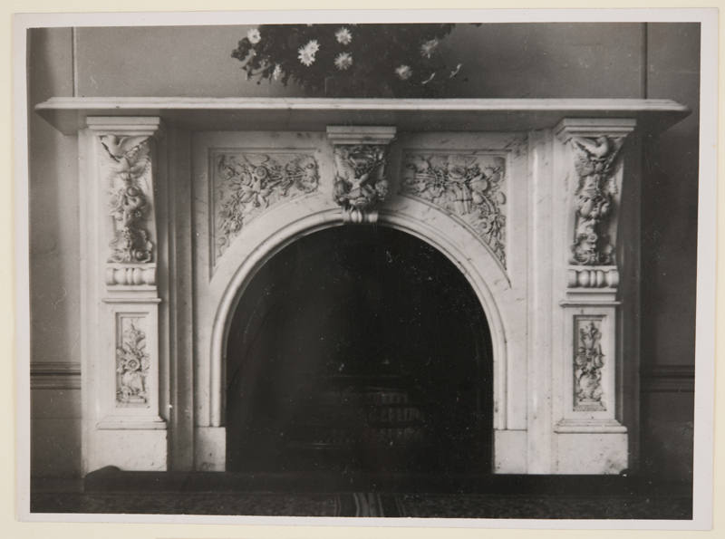 Description: This is a a copy of a photo from the archival series ‘Photographs of Departmental Institutions’, Volume 1, the original caption states: Beautiful white marble fireplace in the Assembly Room.