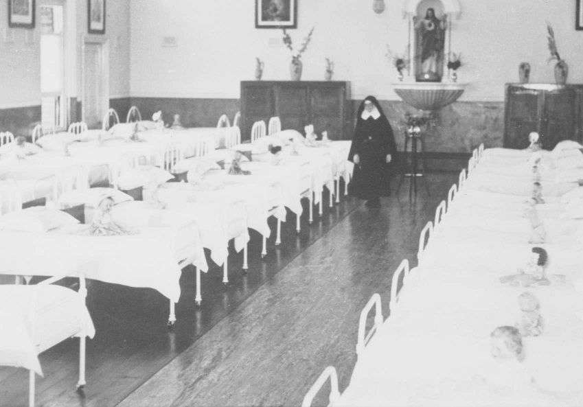 Description: ‘Subiaco Dormitory 2’ is a digital copy of an undated photograph from the Institute of Sisters of Mercy of Australia and Papua New Guinea Archives and Heritage Centre. It shows a dormitory at the St Vincent’s Foundling Home. An approximate date range of 1920s to 1960s has been given, based on the style of the dolls on the beds. It is possible that the picture was taken when the dormitory was decorated for a special event.