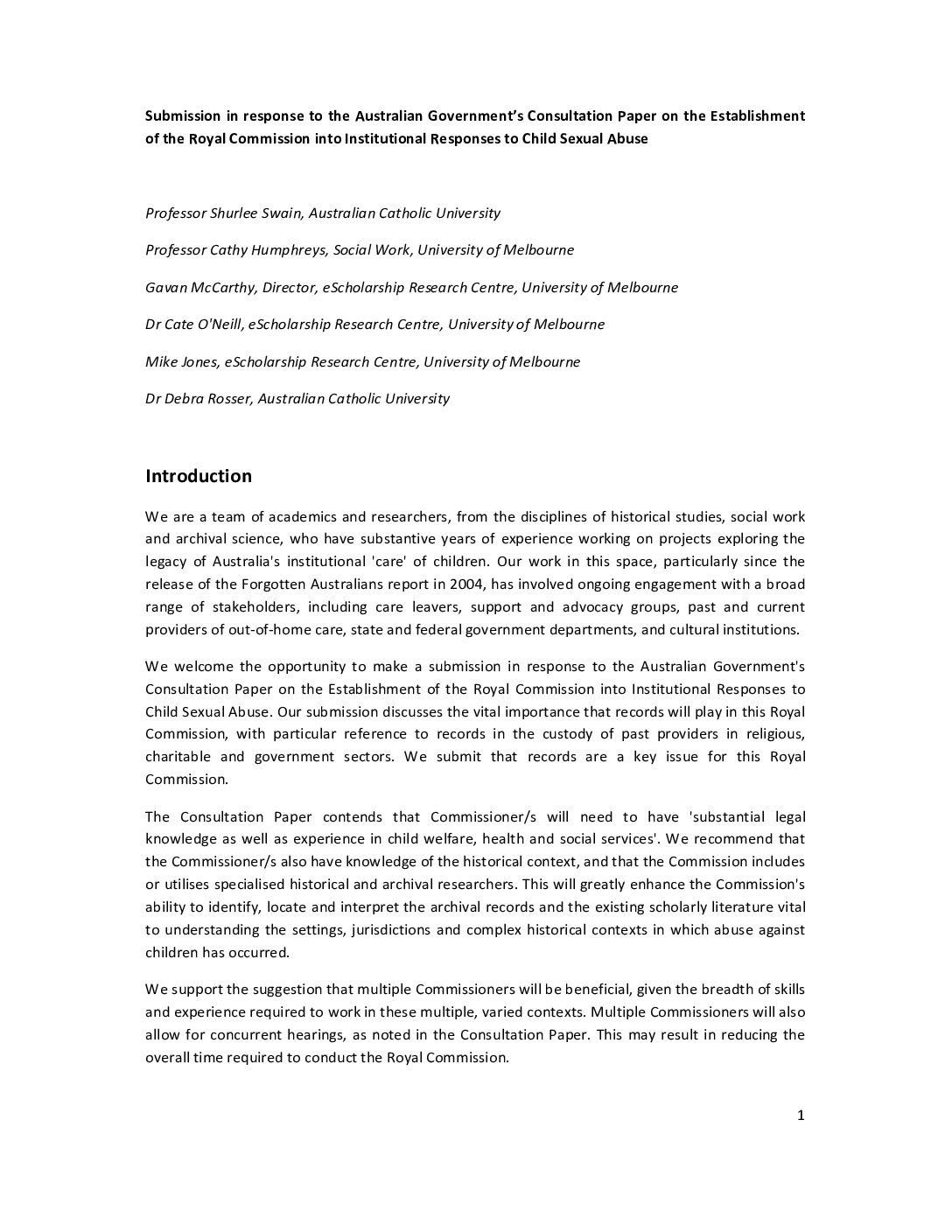 Description: This is a copy of the Submission by Professor Shurlee Swain, Professor Cathy Humphreys, Associate Professor Gavan McCarthy, Mike Jones, Cate O’Neill and Debra Rosser, in response to the Consultation Paper on the Establishment of the Royal Commission into Institutional Responses to Child Sexual Abuse