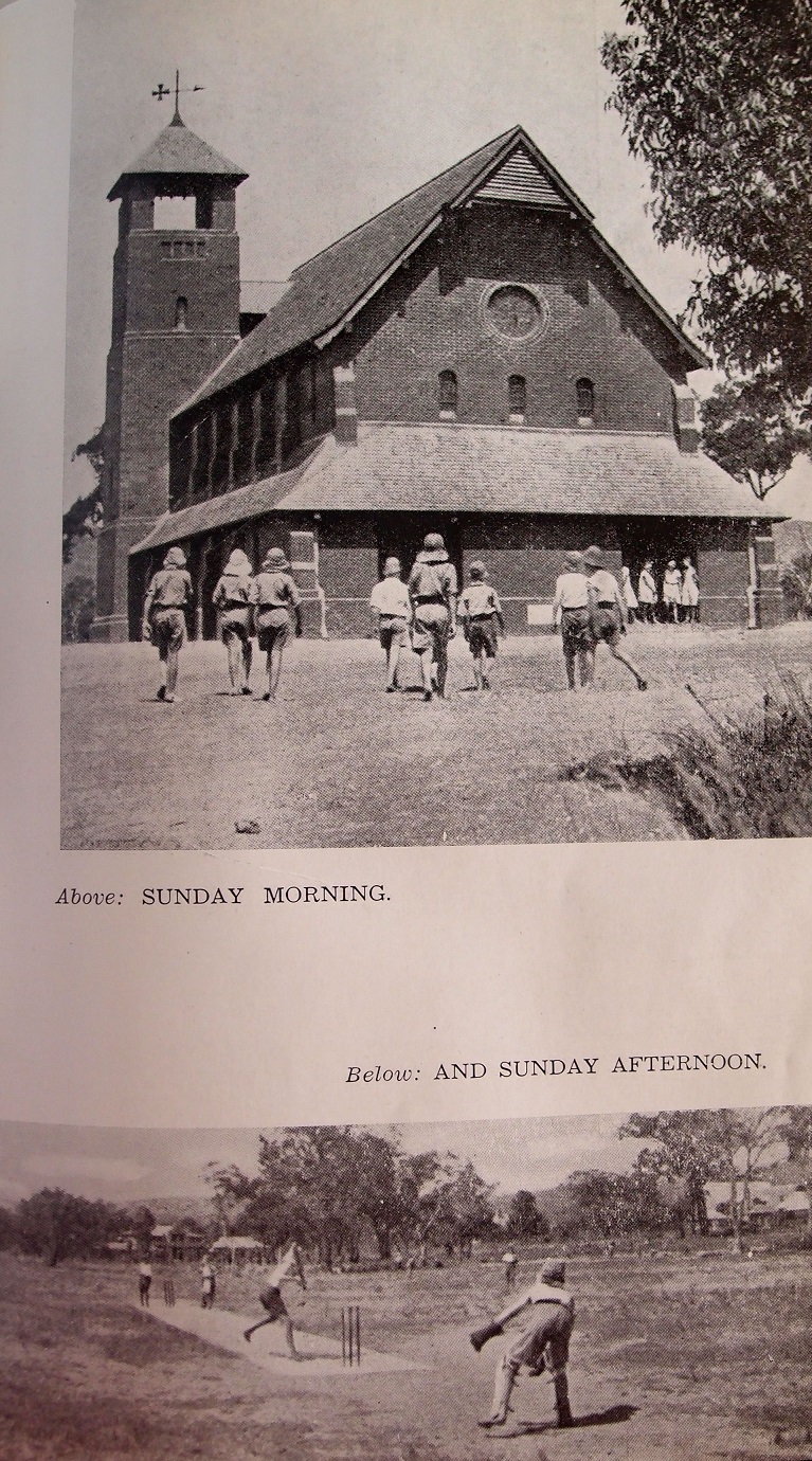 Description: ‘Sunday morning and afternoon, [Fairbridge, 1940s?]’ are two photographs showing activities of children at Fairbridge, Pinjarra. The top image shows children going to church in the morning, and the bottom images shows them playing cricket in the afternoon.