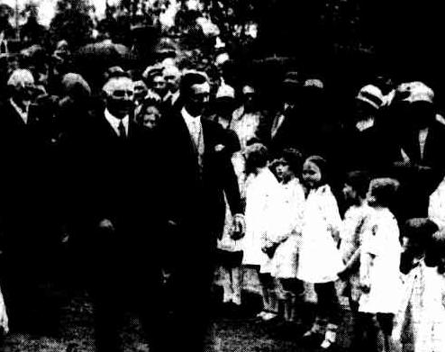 The original caption reads, ‘A new building for the Sutherland Homes for Children was opened by His Excellency the Governor (Lord Somers) at Greensborough on Saturday afternoon. Left: Lord Somers, accompanies on arrival by Mr. Smith M.L.C. walking between a guard of honour consisting of children from the Homes and Boy Scouts. Right: General view as Lord Somers declared the building open.’