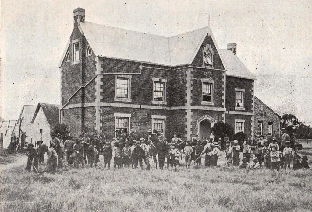 This image shows a group of approximately 40 boys standing in front of a large three-storey brick building. Some of the older boys are holding long-handled tools, including hoes and shovels.