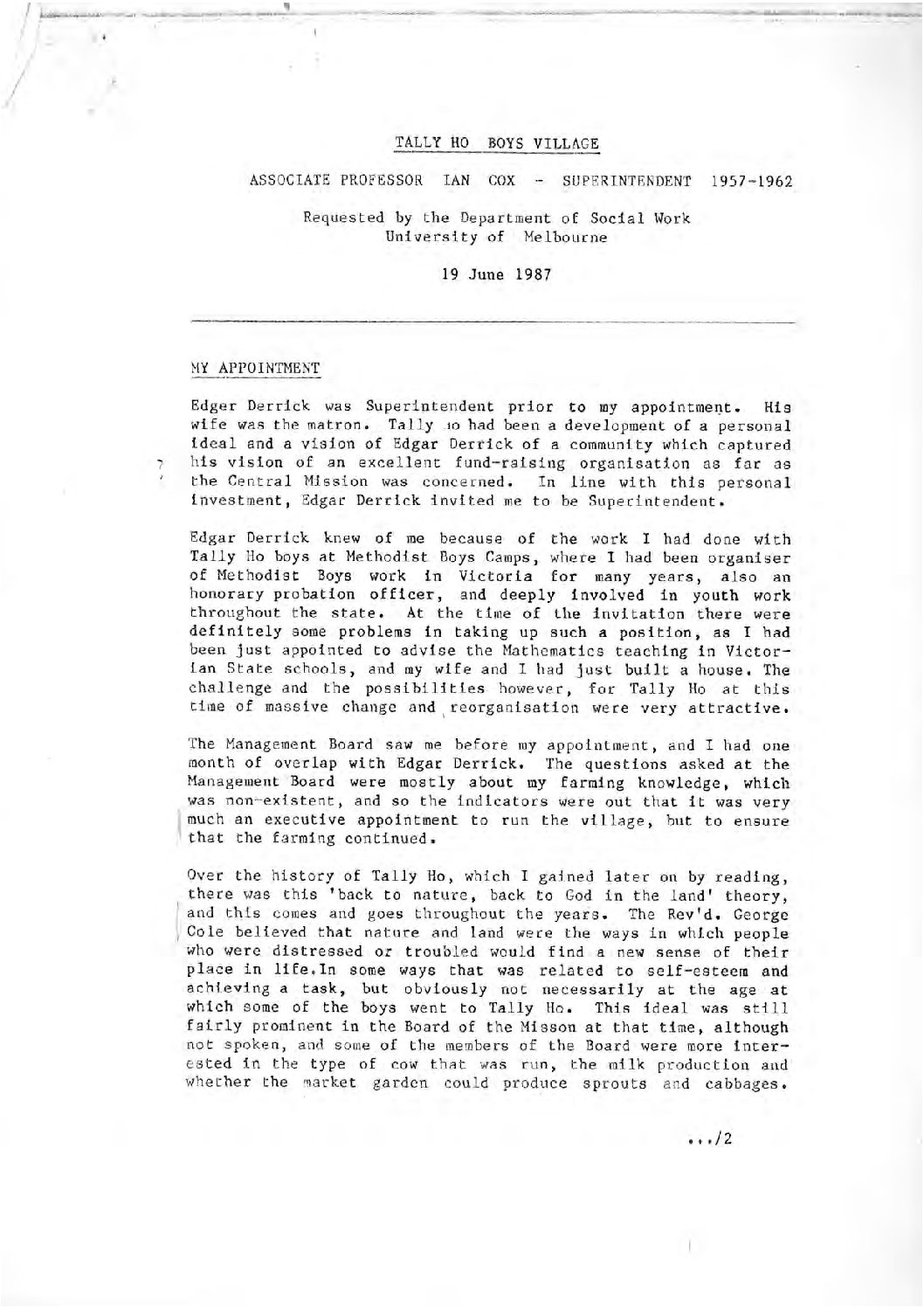 Description: This is a copy of a document with the title: ‘Tally Ho Boys Village – Associate Professor Ian Cox, Superintendent 1957-1962 – Requested by the Department of Social Work, University of Melbourne, 19 June 1987’.