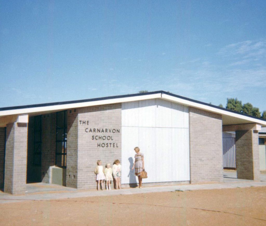 Description: This is an image of the Carnarvon School Hostel. It shows three children and a teacher (identified as Miss Karin Krupa) standing in front of the hostel.