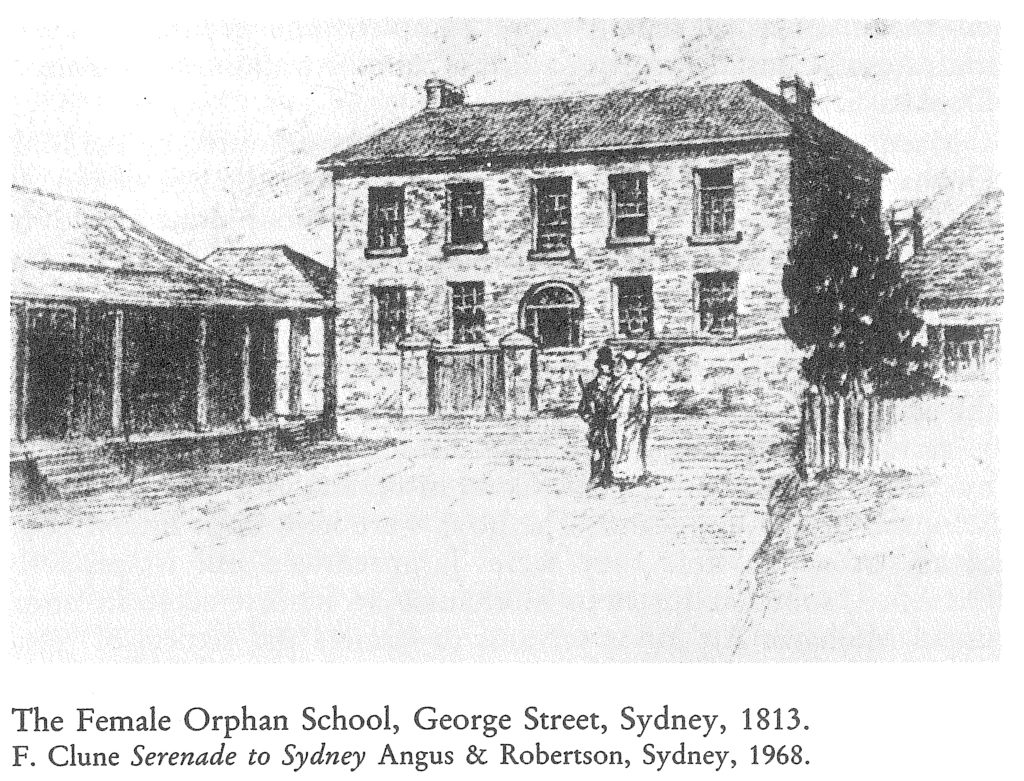 Description: This is a sketch of the Female Orphan School building on George Street, Sydney, as it was in 1813. It shows a large two-storey building with a stone wall in front of it, surrounded by smaller cottages. The building was used as the Female Orphan School until 1818, and then used as the Male Orphan School until 1823.