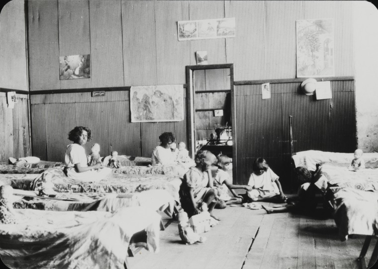 Description: This is an image of the girls’ dormitory at Mt Margaret Mission. It shows several girls inside the dormitory; some sitting on beds holding dolls and others sitting on the floor playing with a tea set. The beds in the room are arranged in three rows and are placed close together. There are several pictures hanging on the dormitory walls.