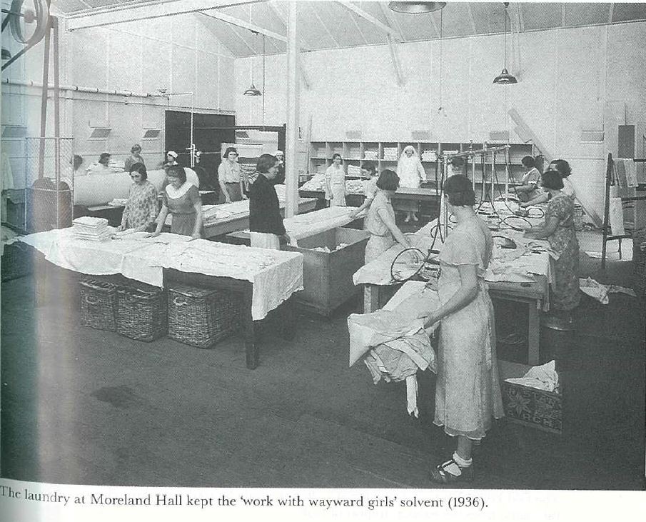 Description: This is an image of residents of Moreland Hall working in the laundry. It shows 17 young women working at various stations in the laundry. They are being supervised by a member of staff.