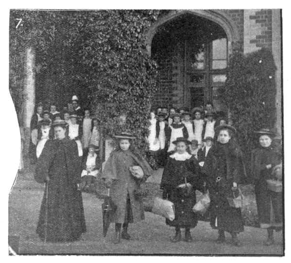 Description: Image published in the Illustrated Australian News. Shows group of young girls in smocks, others dressed for travelling, standing at the entrance to the orphanage.