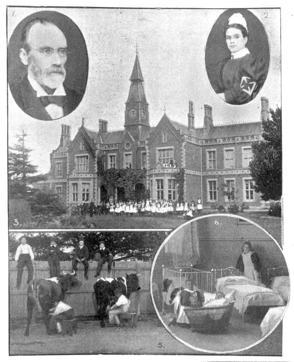Description: Image published in the Illustrated Australian News. Includes oval portraits of Mr. Exon, bust, to left, and Mrs. Wooton, half-length, to right; front of the building with boys and girls standing in rows; two children milking, four boys sitting on the fence behind them watching; cots, cradles, cast-iron beds in the dormitory.