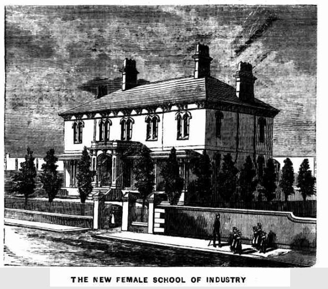 Description: This image is an illustration of the Female School of Industry at Darlinghurst. The illustration was made before construction of the building had been completed. The image shows a large two-storey building surrounded by high stone and iron fences. It also depicts several young girls in uniform standing outside of the house, possibly meant to be residents of the school. This image was published in The Sydney Mail and New South Wales Advertiser on 3 August 1872. The title was provided by the newspaper.
