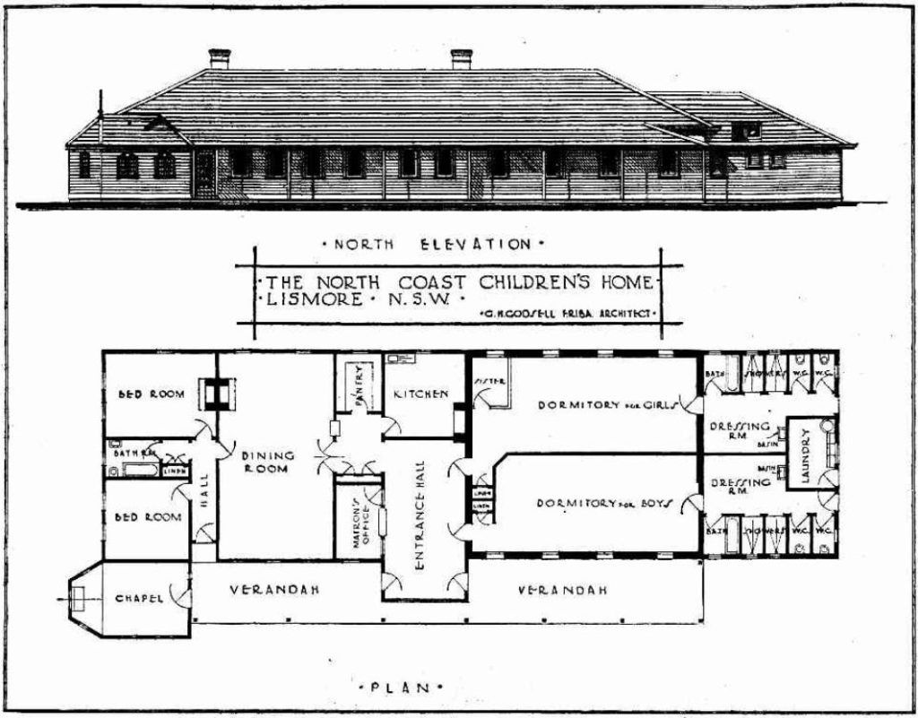 Description: This illustration shows the proposed floorplan and North elevation of the North Coast Children’s Home. It was published in the Lismore Northern Star on 2 October 1935.
