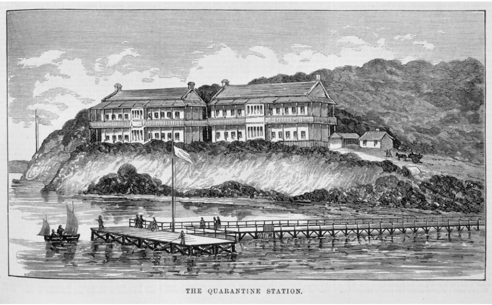 Description: This is an engraving of the Quarantine Station at Point Nepean in 1877, also known as the Sanatory Station. It had previously been used by the Department of Industrial and Reformatory Schools for the quarantining of children with infectious diseases.
