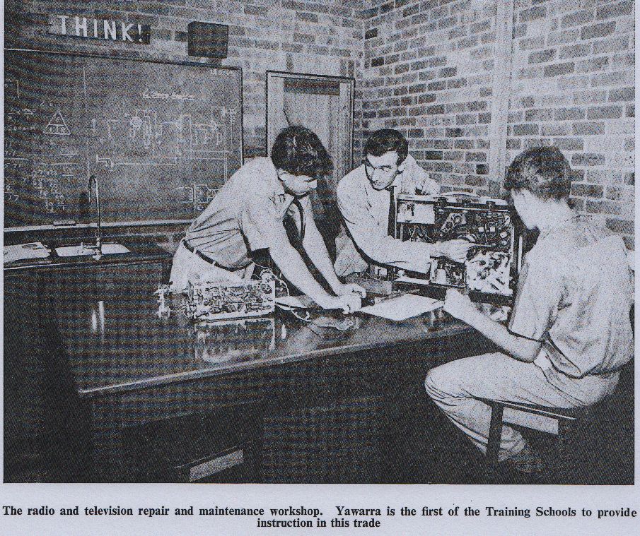 The radio and television repair and maintenance workshop. Yawarra is the first of its training schools to provide instruction in this trade