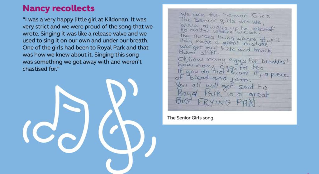 The newsletter contains this recollection from Nancy: “I was a very happy little girl at Kildonan. It was very strict and we were proud of that song that we wrote. Singing it was like a release valve and we used to sing it on our own and under our breath. One of the girls had been to Royal Park and that was how we knew about it. Singing this song was something we got away with and weren’t chastised for”.