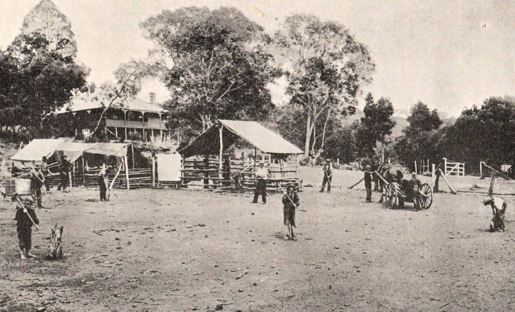 This image shows approximately 10 boys and men standing in dirt yard, bordered by simple timber sheds, with a large two-storey house visible in the background. Most of the boys and men are holding long-handled tools such as mattocks and picks. The boys appear to be working bare-foot.