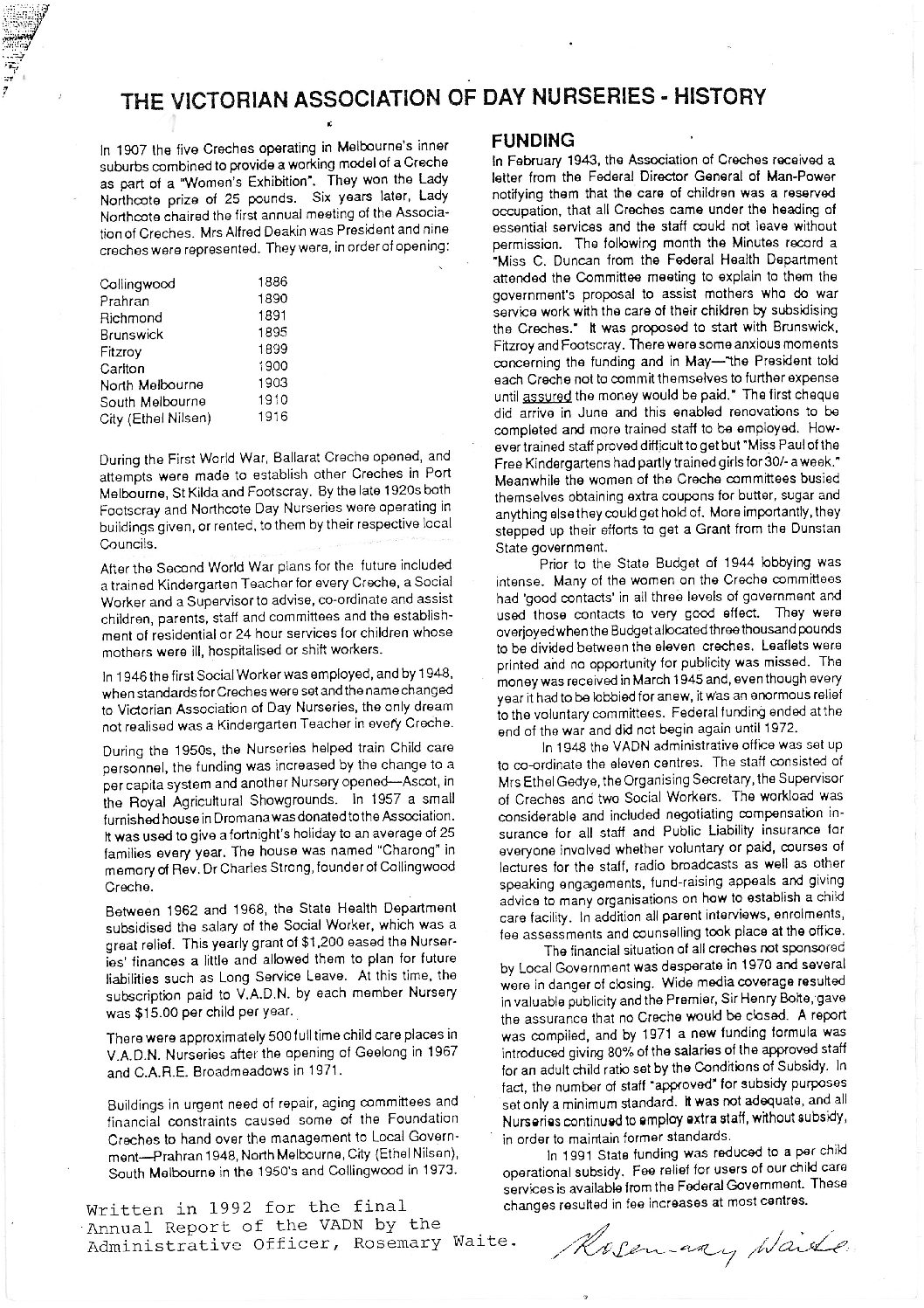 Description: This is a 2 page document relating the history of the Victorian Association of Day Nurseries. The author of the document is Rosemary Waite