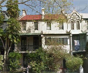 Description: This is an image of Caretakers Cottage Surry Hills location. It shows a group of three-storey terrace houses, with white render, red roofs, and second-floor balconies (one enclosed). At the top of the right-most terrace is a inscription which reads “1869 Carlingford Terrace”.