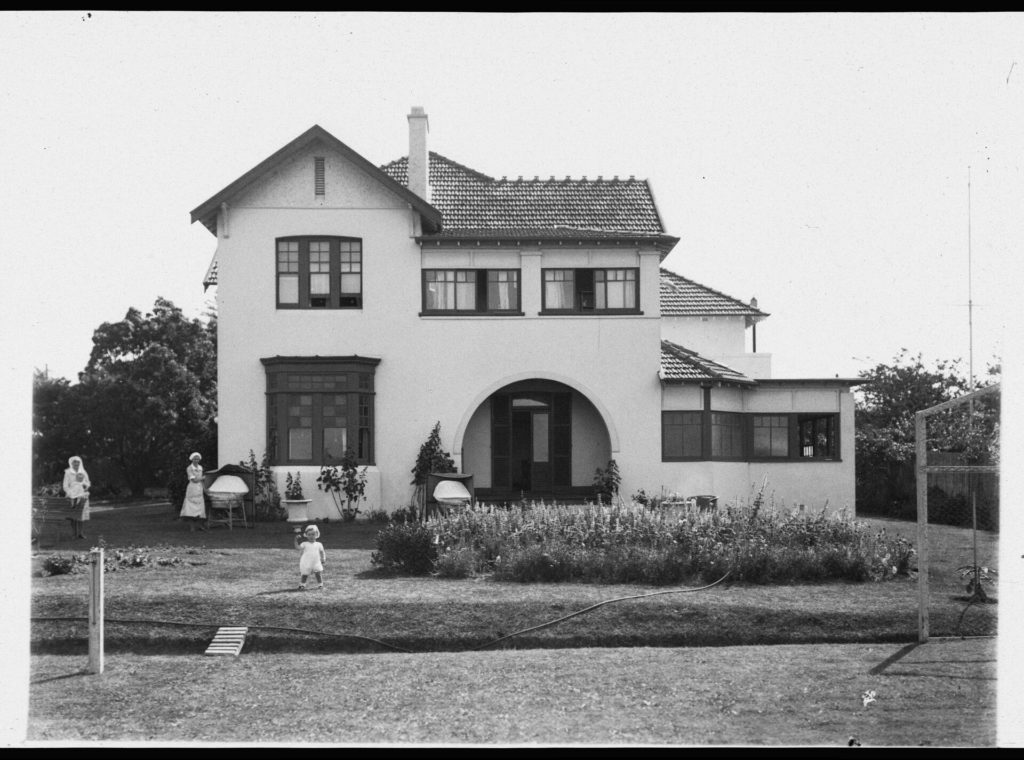 Description: This is a photograph of the Tresillian North Home, Willoughby. It shows two babies and two nurses standing in the front garden of the large, two-storey white-rendered house.