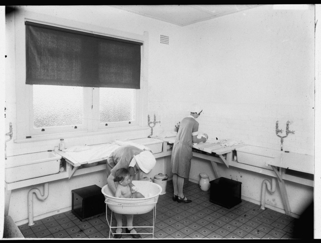 Description: This is a photograph of babies being bathed at the Tresillian North Home, Willoughby. It shows two babies with nurses, one being washed in a small basin, the other being dried and wrapped on a bench.