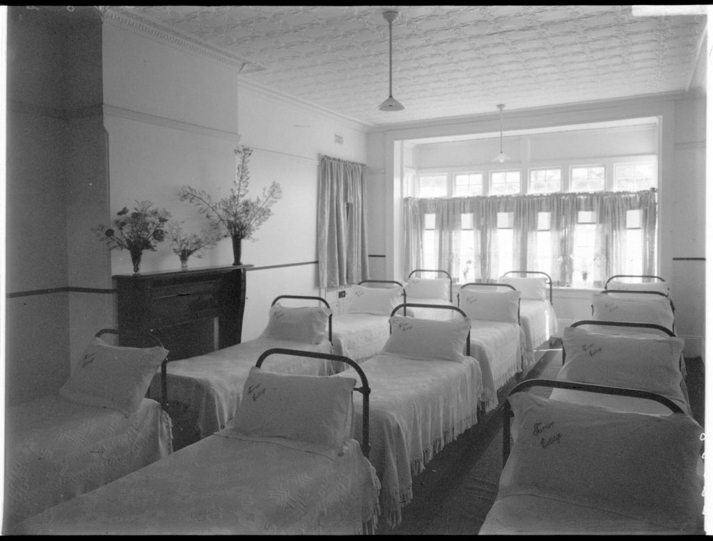 Description: This is a photograph of a dormitory at Turner Cottage, Mittagong. It shows a large bedroom filled with 12 beds in rows. There is no other furniture in the room. All beds have ‘Turner Cottage’ embroidered on the corner of the pillowcase.