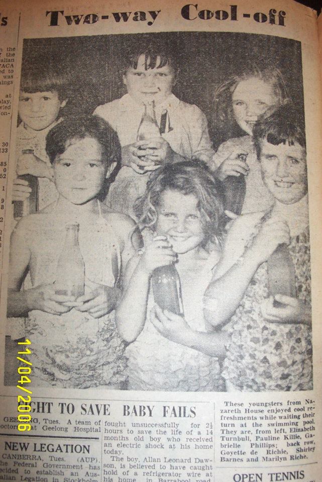 Description: This is a copy of a newspaper clipping from 1963 or 1964, showing a group of children from Nazareth House, Ballarat, who were at a swimming pool.