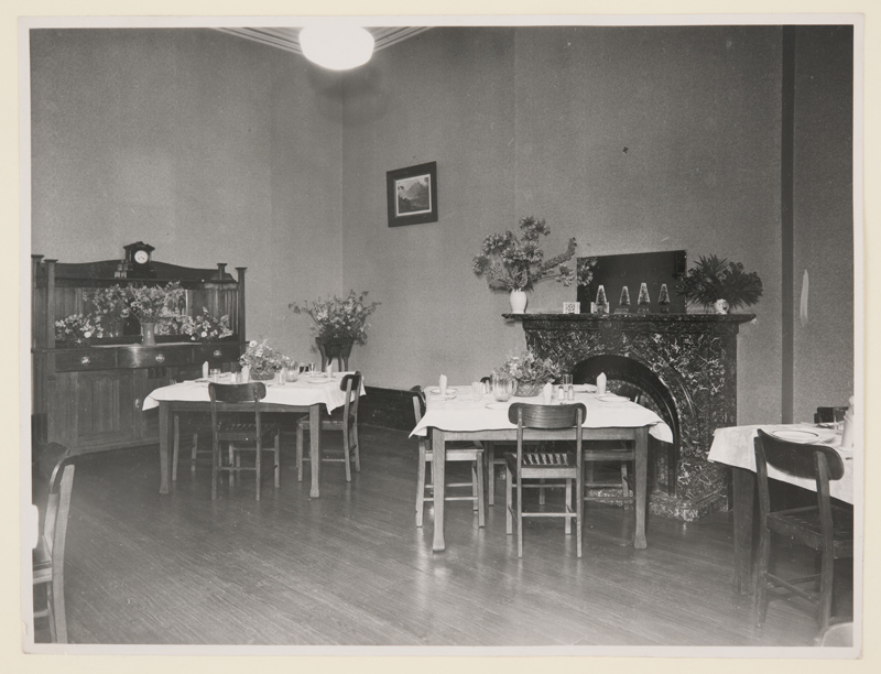 Description: This is a a copy of a photo from the archival series ‘Photographs of Departmental Institutions’, Volume 2, the original caption states: Portion of the dining room, showing table ameinities. 1947.