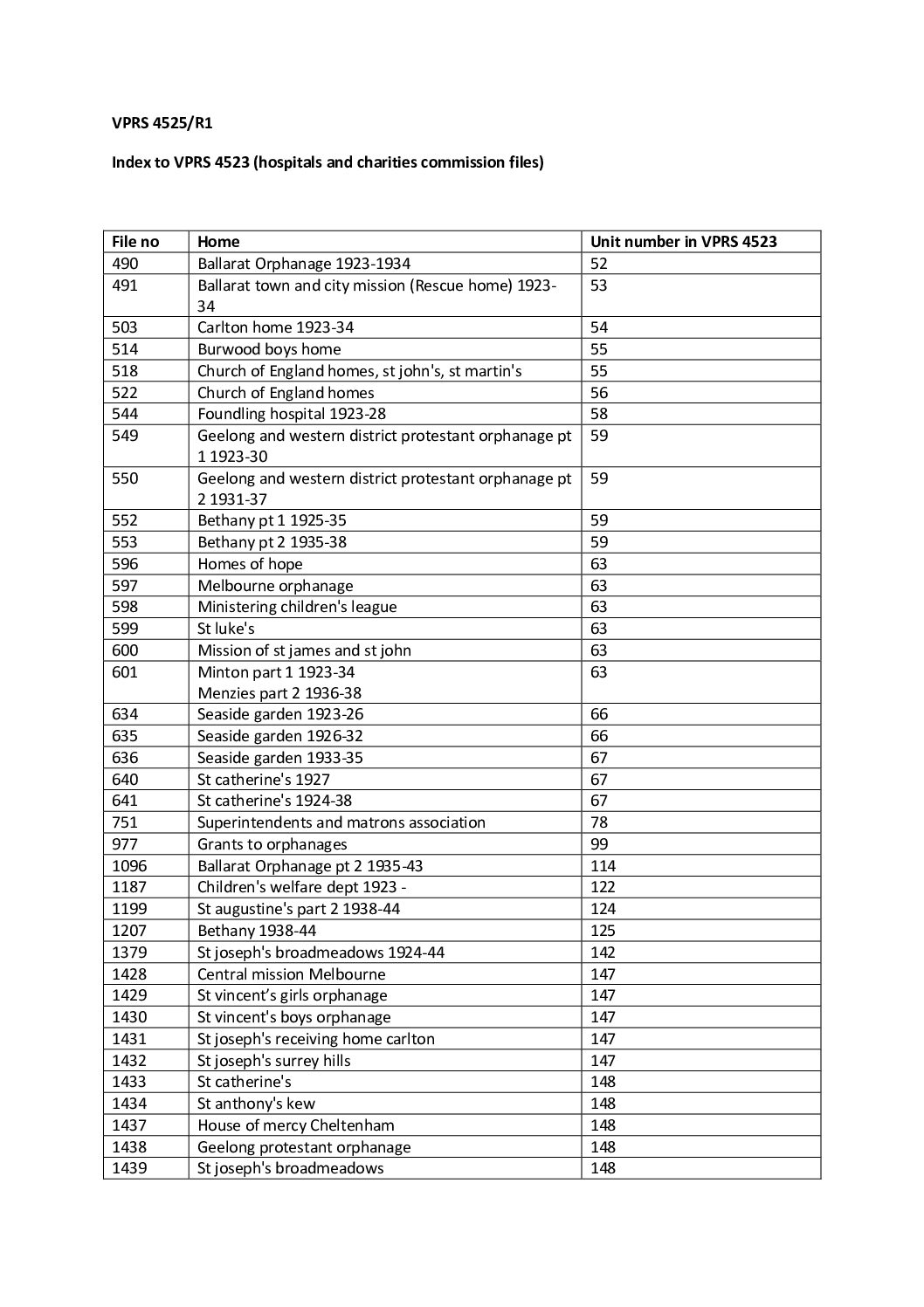 Description: List contains names, unit and file numbers of children’s homes included in the series VPRS 4523, PROV.