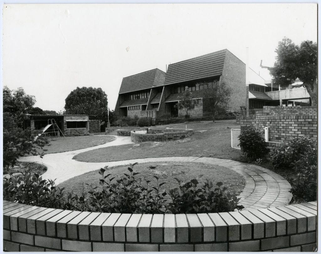Description: This is a photograph of the Warilda Receiving and Assessment Centre in 1979. It shows a garden with brick walls and children’s play equipment in front of a two-storey brick building with a sloping face. Walkways connecting to other parts of the centre can be seen at the back of the brick building.