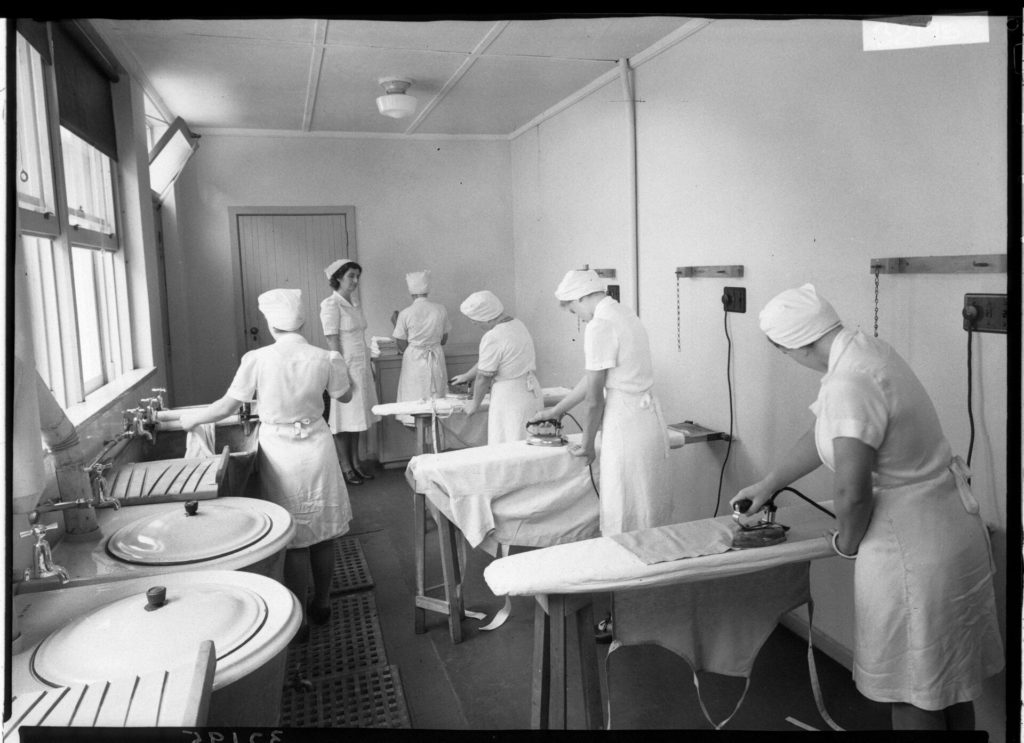 Description: This is a photograph of girls working in the laundry at Ormond, Thornleigh. It shows five girls all in white uniforms and headscarves, ironing, washing, and folding clothes, under the supervision of a staff member.