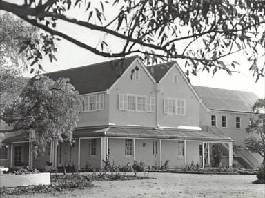 Description: The photograph is taken looking at the northern side of the house. Werrington Park is located on the Great Western Highway Werrington. The house stands on what was once the land grant Frogmore, given to Mary Bligh and her husband John Putland in 1806 by Governor King. There is some conjecture as to whether the house is partly that of the original home built for Mary and her second husband Maurice O’Connell. The house has had extensive renovations with the modern Werrington Park being created by Alan and Laura Williams in the 1930s. During the 1950s the property and house become a home for intellectually disabled boys but was eventually sold to the University of Western Sydney. The house is now the Chancellery building for the University and has been renamed Frogmore. The property was also known as Brooklands.