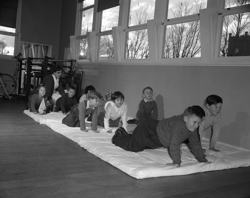 Wingfield Home, Physiotherapy Department gym, class work for cerebral palsied children to teach control and strength
