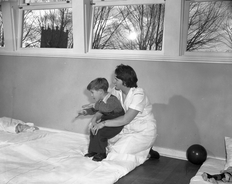 Wingfield Home, Physiotherapy Department gym, one of a series of exercises used to re-educate strength and control for standing