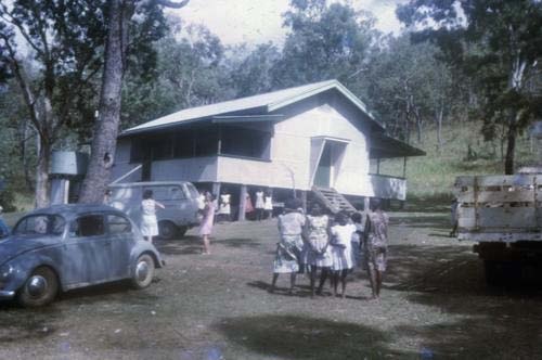 Young girls in front of the girls' dormitory at Wujal Wujal Mission, Queensland, ca. 1975
