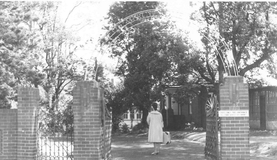 Description: This is a copy of an image from the Sisters of Mercy, North Sydney Congregation archives collection. This image shows the back of a woman standing at the entrance gates of Our Lady of Mercy Home, Waitara.