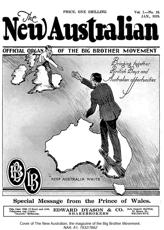 There were waves of youth migration from Britain to Australia at different times. In the years following World War One, there was a wave of male youth migrants, sent to work in rural areas in Australia. Youth migrants constituted about 10% of British migration to Australia during the 1920s (Sherington, 2002). The youth migration schemes of the 1920s helped to strengthen British Imperial ties and were explicitly tied to Australia’s White Australia Policy. Youth migration to Australia during this period was governed by an Imperial Act, the Empire Settlement Act 1922, and the Joint Commonwealth and States Scheme of 1921 which transferred responsibility for immigration from states to the Commonwealth.